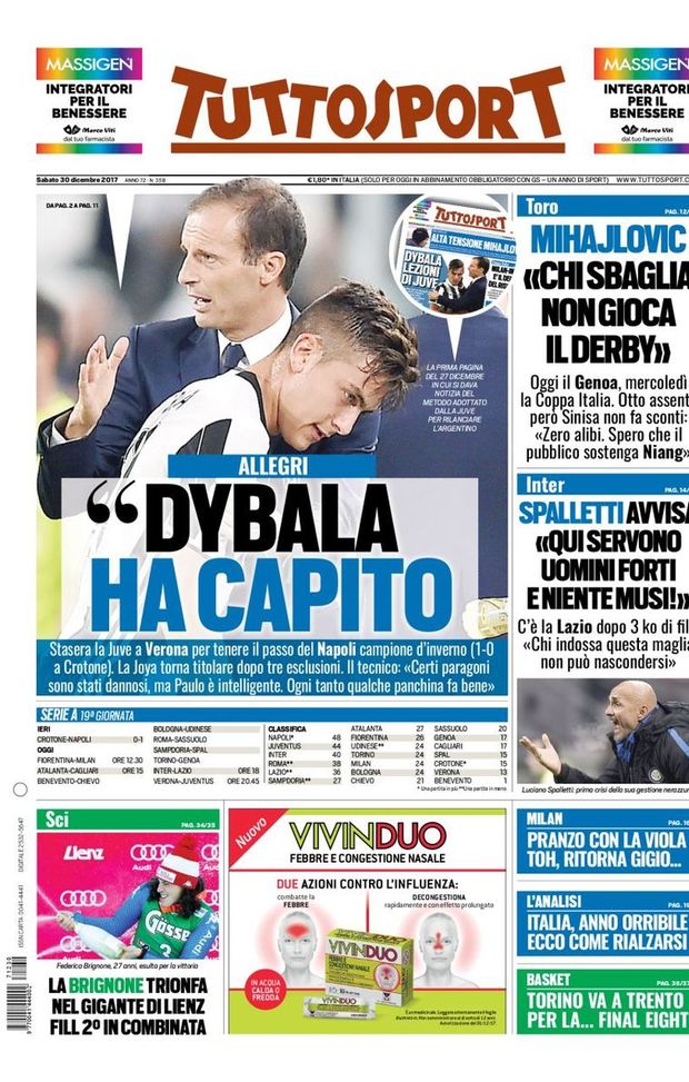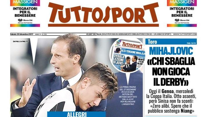 Il titolo che TuttoSport dedica all'Inter quest'oggi è tratto dalla conferenza stampa di Spalletti: "Qui servono uomini forti e niente musi. Chi indossa questa maglia non può nascondersi". Il giornale aggiunge: "C'è la Lazio dopo tre ko di fila", ovviamente compresa la sfida di Coppa Italia contro il Milan. Il centro pagina è dedicato alla Juventus e alle parole di Allegri su Dybala: "Ha capito, certi paragoni sono stati dannosi, ma lui è intelligente. Ogni tanto qualche panchina fa bene".