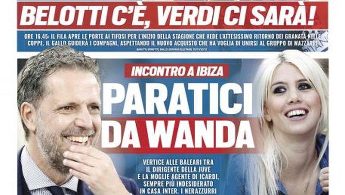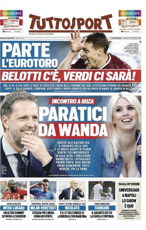 "Incontro a Ibiza Paratici-Wanda: vertice alle Baleari tra il dirigente della Juve e la moglie agente di Icardi, sempre più indesiderato in casa Inter. I nerazzurri hanno fretta, l'attaccante prende tempo". La prima pagina di Tuttosport in edicola giovedì 4 luglio 2019 regala la copertina all'incontro tra Fabio Paratici e Wanda Nara ad Ibiza. In taglio basso, si parla ancora di Inter: "Dzeko bloccato. Inter-Lukaku, un altro summit: si prova a chiudere".