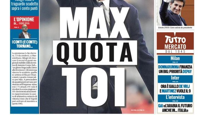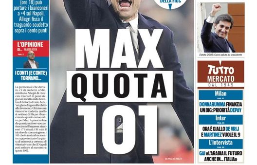 TuttoSport in edicola oggi apre la sua prima pagina come sempre con la Juventus e con Massimiliano Allegri che è il protagonista della foto in primo piano: "Max 101" è il titolo e ci si riferisce ai conti fatti dal tecnico per la quota scudetto: i punti che servono per la vittoria del titolo secondo lui sono quelli. In una delle finestre c'è anche spazio per l'Inter: "Ora è giallo de Vrij e Lautaro Martinez vuole il 9".