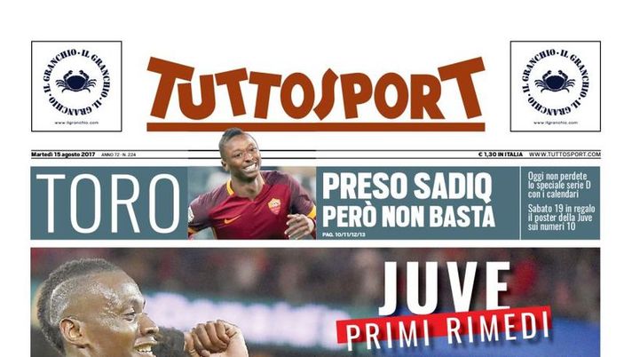 La prima pagina di Tuttosport in edicola martedì 15 agosto 2017