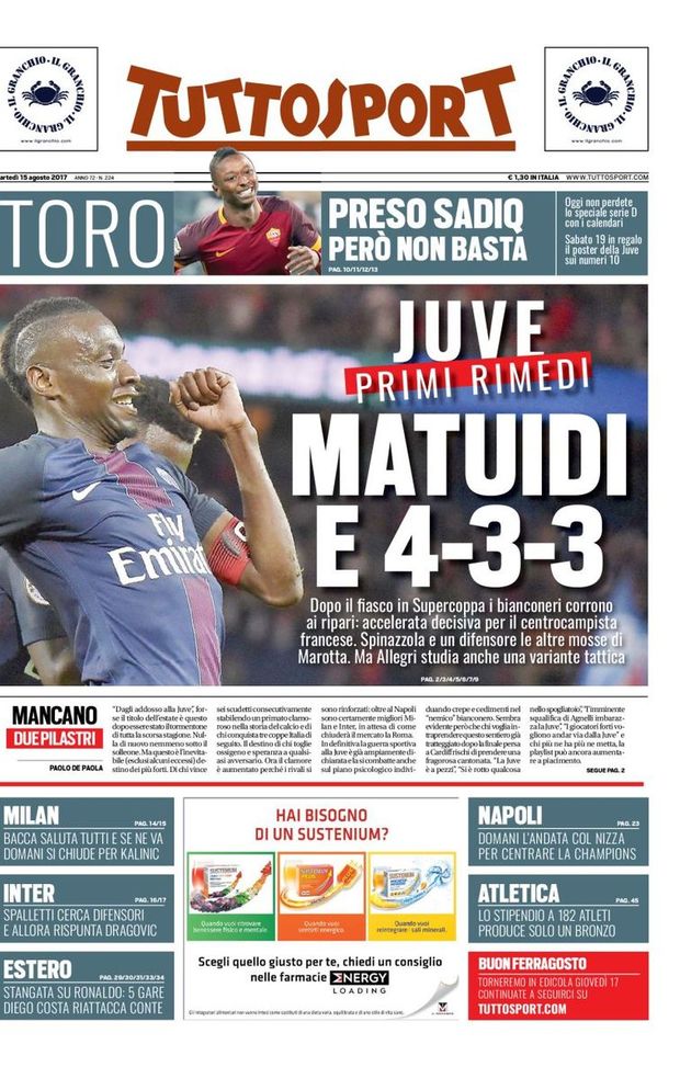 Spazio anche all'Inter nella prima pagina di Tuttosport in edicola martedì 15 agosto 2017: "Spalletti cerca difensori e allora rispunta Dragovic". Copertina dedicata alla Juventus: "Matuidi e 4-3-3, i primi rimedi. Poi Spinazzola ed un altro difensore" mentre in taglio alto c'è il Torino: "Preso Sadiq però non basta".