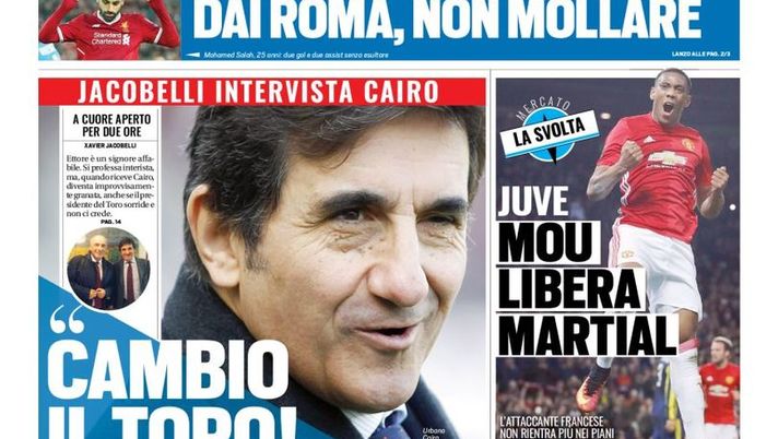 TuttoSport ha intervistato il presidente del Torino Urbano Cairo che parla del futuro della sua squadra con al centro del progetto ancora Andrea Belotti. La Juventus invece pensa al mercato e ad un nome accostato in Inghilterra anche all'Inter: un anno fa si parlava di lui nella trattativa per Perisic. "Juve, Mou libera Martial. L'attaccante francese non rientra più nei piani del Manchester United. Marotta in pressing: sfida a Barça e Bayern". Il taglio alto è dedicato alla Roma: "Dai Roma, non mollare. Semifinali di Champions, Salah devastante nel 5-2 del Liverpool, ma Dzeko e Perotti tengono viva la speranza di un'altra rimonta". Il titolo sui nerazzurri invece è: "Inter, Spalletti rinnova anche senza Champions".