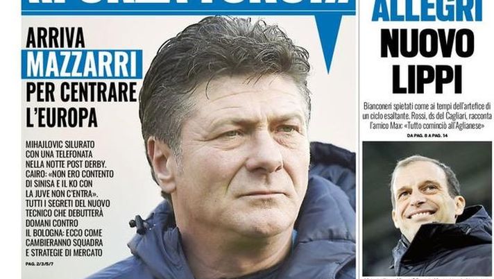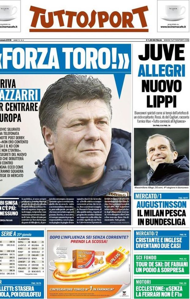 La prima pagina di Tuttosport apre con l'arrivo di Walter Mazzarri sulla panchina del Torino. Inter, in serata l'impegno con la Fiorentina, poi si parlerà di Deulofeu.