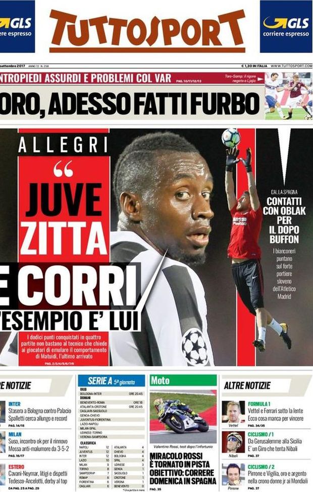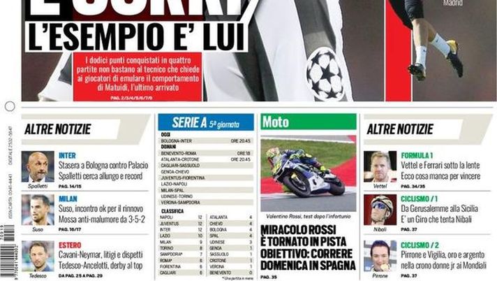 "Stasera a Bologna contro Palacio, Spalletti cerca allungo e record". Questo è il titolo che TuttoSport dedica sulla sua prima pagina all'Inter impegnata stasera al Dall'Ara per l'anticipo del turno infrasettimanale. Parte centrale dedicata come sempre alla Juventus con Matuidi che è l'esempio: "Allegri, Juve zitta e corri come lui". Per il dopo Buffon contatti con Oblak.