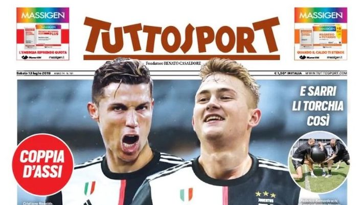 "Inter, svolta attacco. Ora Conte ha fretta. E' Rebic l'alternativa. Il croato nel mirino nerazzurro qualora non si riuscisse a chiudere per Lukaku". La prima pagina di Tuttosport in edicola sabato 13 luglio 2019 parla così di Inter. In copertina, invece, spazio alla Juventus e al colpo de Ligt.