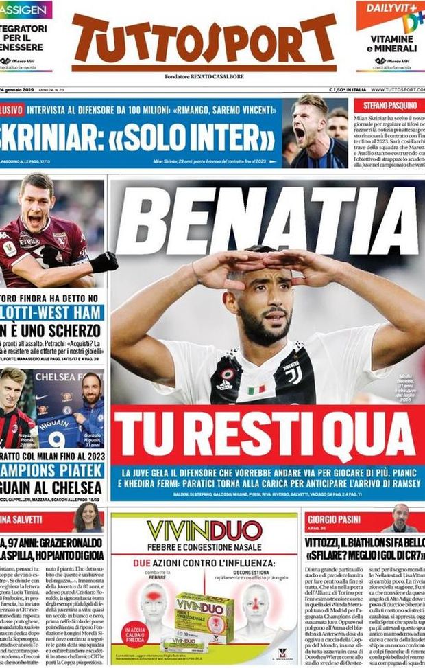 La prima pagina di Tuttosport in edicola giovedì 24 gennaio 2019 propone uno stralcio dell'intervista a Milan Skriniar che giura amore eterno ai nerazzurri: "Solo Inter". Intervista al difensore da 100 mln: "Rimango, saremo vincenti". La copertina è dedicata al futuro di Benatia mentre di spalla c'è spazio anche alle ufficialità di Piatek (Milan) e Higuain (Chelsea).