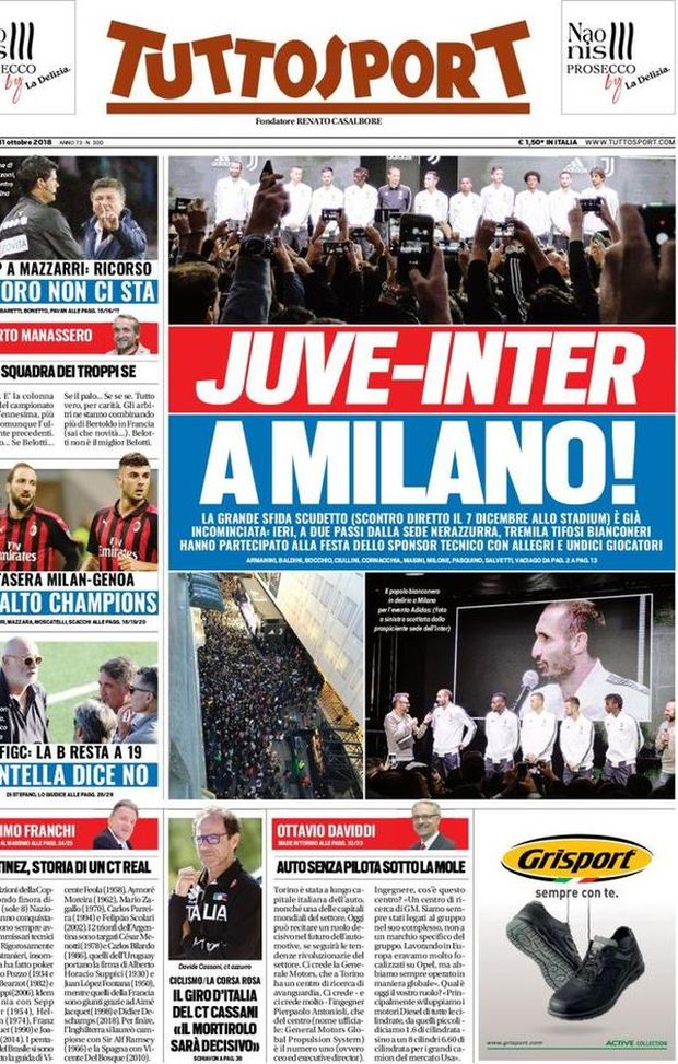 Si parla già di Juve-Inter in ottica Scudetto sulla prima pagina di Tuttosport. Le due squadre si sfideranno il 7 dicembre allo Stadium: "Juve-Inter a Milano! La grande sfida Scudetto (scontro diretto il 7 dicembre allo Stadium) è già incominciata: ieri, a due passi dalla sede nerazzurra, tremila tifosi bianconeri hanno partecipato alla festa dello sponsor tecnico con Allegri e undici giocatori", è il titolo del quotidiano.