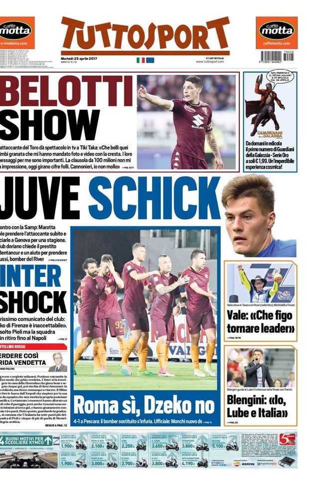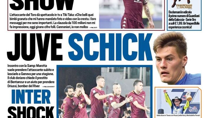 La prima pagina di TuttoSport è dedicata alla Juventus, ma anche all'Inter. Nel senso che il titolo principale riguarda un obiettivo nerazzurro: "Juve Schick. Incontro con la Samp: Marotta vuole prendere l'attaccante subito e lasciarlo a Genova per una stagione. Il club doriano chiede il prestito di Bentancour e un aiuto per prendere Driussi, giocatore del River!". E invece Inter scock, durissimo comunicato del club: "Il ko di Firenze è inaccettabile". Assolto Pioli, ma la squadra fa in ritiro fino al Napoli".