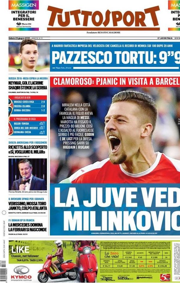 EDICOLA / TS: La Juve vede Milinkovic. Pjanic visita Barcellona. I Ricketts sul Milan