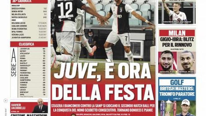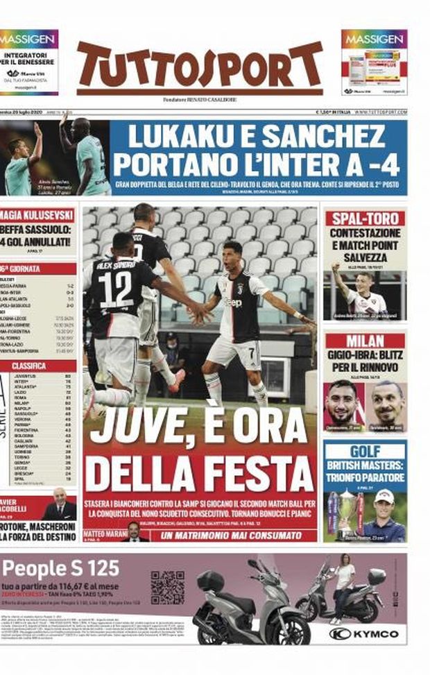 Primo piano dedicato all’impegno della Juventus contro la Sampdoria, sulla prima pagina di TuttoSport in edicola domani mattina. I bianconeri con una vittoria vincerebbero lo scudetto, altrimenti la matematica lascerebbe ancora un piccolo spiraglio all’Inter, reduce dalla vittoria a sua volta sul Genoa ed ora seconda a -4.