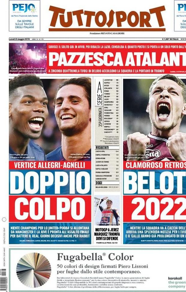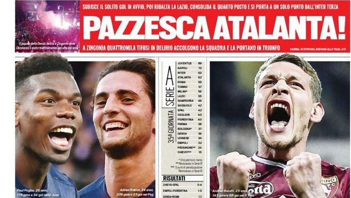 Si parla, in ottica Champions, sulla grande impresa dell'Atalanta (3-1 alla Lazio all'Olimpico) nell'ultima giornata di Serie A sulla prima pagina di Tuttosport in edicola nelle prossime ore: "Pazzesca Atalanta! Subisce il solito gol in avvio, poi ribalta la Lazio, consolida il quarto posto e si porta a un solo punto dall'Inter terza. A Zingonia 4000 tifosi in delirio accolgono la squadra e la portano in trionfo".