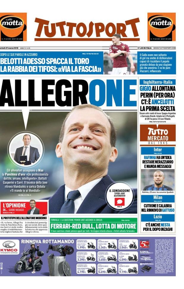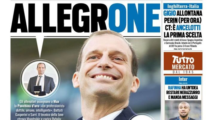 Il giornale torinese dedica ad Allegri il centro pagina: "Allegrone", il titolo principale per l'allenatore che ha vinto la sua terza 'Panchina d'oro'. Si parla anche del rinnovo di Gattuso: "Dentro al rinnovo Cutrone e Calabria". Idea diversa rispetto ad altre voci sul futuro ct dell'Italia: "E' Ancelotti la prima scelta". E sul Torino: "Belotti adesso spacca i granata. La rabbia dei tifosi, via la fascia dopo le parole in azzurro".