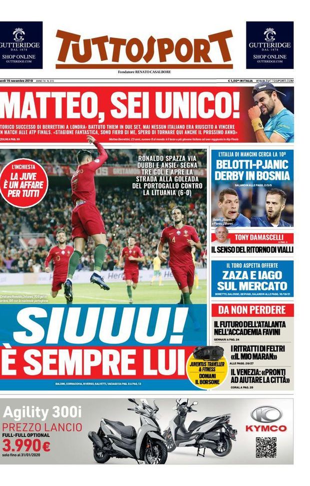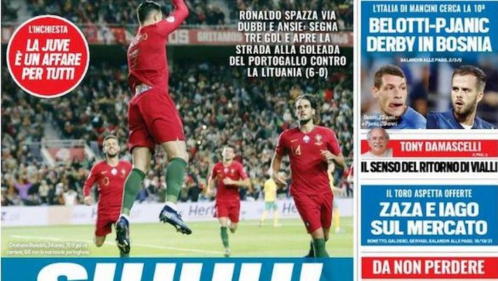 "Siuu, è sempre lui". Il titolo principale di TuttoSport è dedicato a Cristiano Ronaldo e alla vittoria col Portogallo. "Cr7 spazza via dubbi e ansie: segna tre gol e apre la strada alla goleada del portogallo contro la Lituania" (6-0). Spazio anche alla partita di stasera dell'Italia: "Belotti-Pjanic, derby in Bosnia".