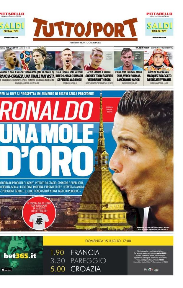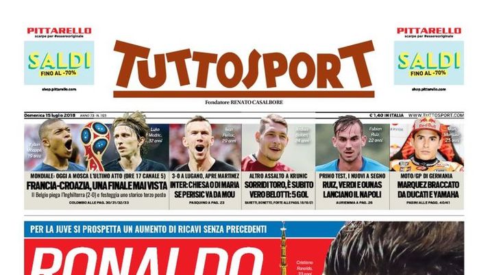 La prima pagina di TuttoSport è dedicata anche oggi a Cristiano Ronaldo e al suo arrivo a Torino: "Ronaldo, una Mole d'oro", è il titolo principale del quotidiano sportivo che nel taglio alto però parla anche del calciomercato e di Inter: "Chiesa o di Maria se Perisic va da Mou", è il titolo dedicato al club nerazzurro. Si torna quindi sulla possibile cessione del croato elogiato nei giorni scorsi dal portoghese. Spalletti però ha fatto capire di volere che resti: "A livello di potenza è il nostro Ronaldo", ha detto in conferenza stampa. Sembrava un messaggio chiarissimo. E ovviamente si parla anche della finale "mai vista" tra Francia e Croazia: in palio la Coppa del Mondo.