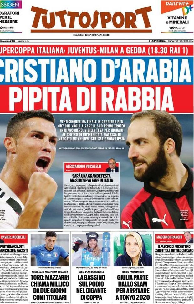 "Cristiano d'Arabia e Pipita di rabbia. Supercoppa Italiana: Juventus-Milan a Gedda (18.30 RAI1). Venticinquesima finale in carriera per Ronaldo che vuole alzare il suo primo trofeo in bianconero. vigilia tesa per Higuain al centro dell'intricata matassa di mercato Milan-Juve-Chelsea-Genoa-Lipsia". Questo il titolo principale di TuttoSport in edicola oggi che parla principalmente della finale che si gioca oggi tra Juventus e Milan.