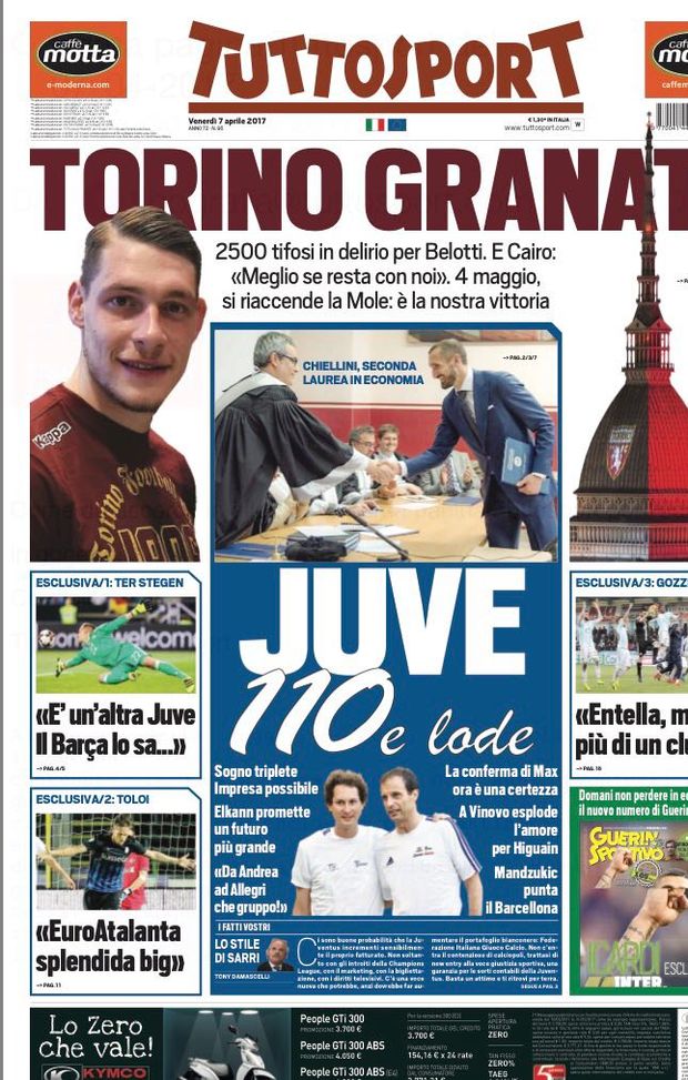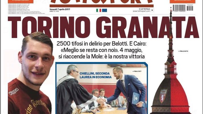 Prima pagina di Tuttosport dedicata all'attaccante del Torino Andrea Belotti che oggi era al Granata Store per incontrare i tifosi. Questo il titolo del quotidiano: "Torino granata. 2500 tifosi in delirio per Belotti. E Cairo: Meglio se resta con noi".