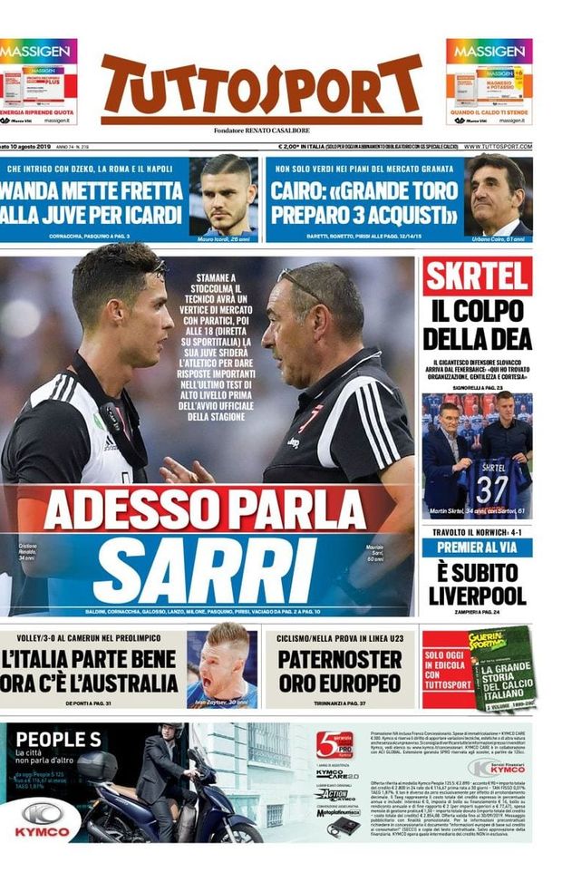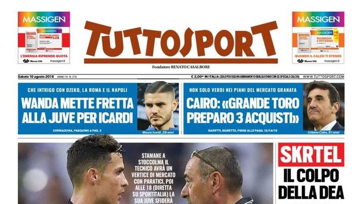 Nel taglio alto della prima pagina di Tuttosport di sabato 10 agosto, spazio anche per il mercato dell'Inter: "Wanda mette fretta alla Juve per Icardi: che intrigo con Dzeko, la Roma e il Napoli".