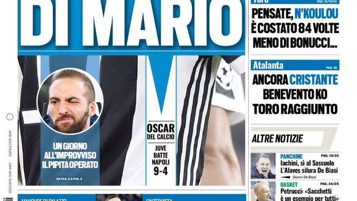 Il giornale sportivo torinese in prima pagina parla dell'infortunio di Higuain e delle parole dell'ex nerazzurro che incensano l'argentino