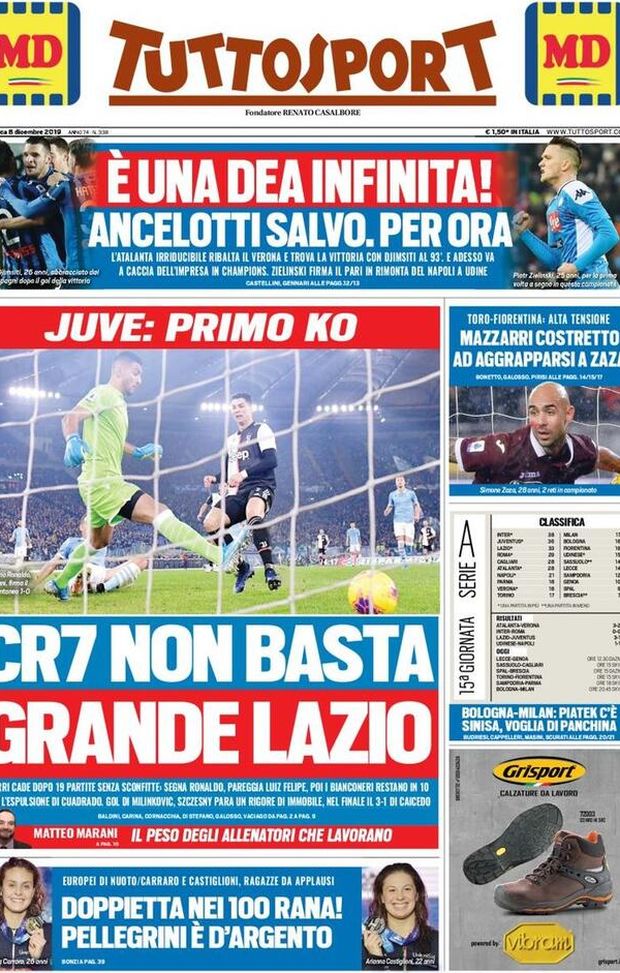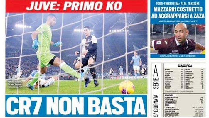 La prima pagina di TuttoSport è dedicata alla sconfitta della Juventus: "Cr7 non basta. Grande Lazio", è il titolo principale del giornale torinese che racconta del primo ko bianconero. Permette all'Inter di restare prima in classifica, ma nessun pensiero viene rivolto ai nerazzurri e al mancato sorpasso juventino. "Sarri cade dopo 19 partite senza sconfitte. Segna Ronaldo, pareggia Luiz Felipe, poi i bianconeri restano in dieci per l'espulsione di Cuadrado. Gol di Milinkovic. Szczesny pare un rigore di Immobile. 3-1, nel finale Caicedo". Nel taglio alto spazio al pari del Napoli: "E' una dea infinita. Ancelotti salvo. Per ora".