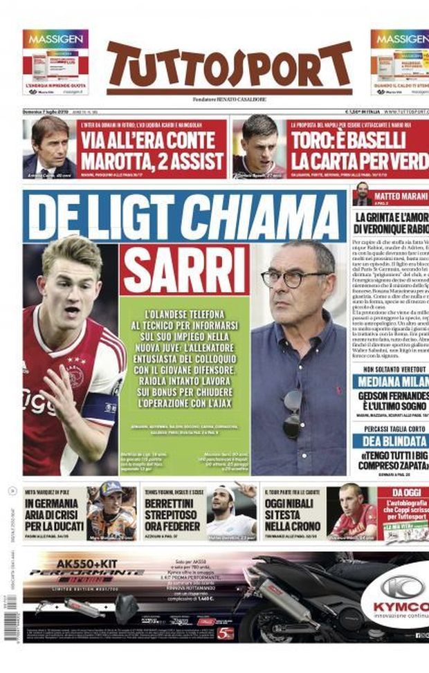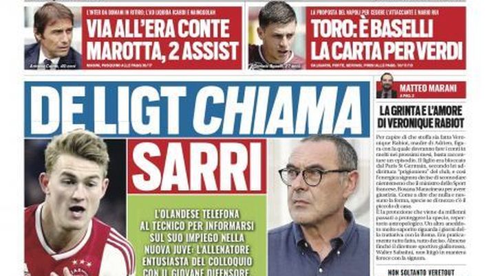 Nel titolo principale è dato ampio risalto alla trattativa Juventus/De Ligt, con il difensore olandese che avrebbe chiamato Sarri per capire quale potrebbe essere il suo ruolo nei Bianconeri.