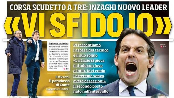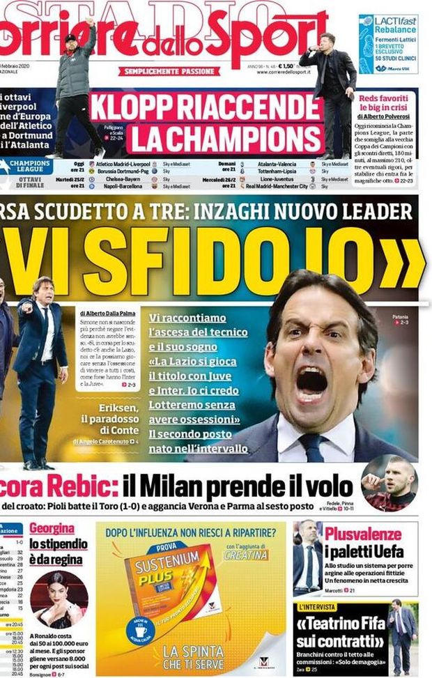 "Eriksen, il paradosso di Conte". Recita così il trafiletto della prima pagina del Corriere dello Sport in edicola martedì 18 febbraio 2020. La copertina è dedicata a Simone Inzaghi: "'Vi sfido io'. Corsa scudetto a tre: Inzaghi nuovo leader. Vi raccontiamo l'ascesa del tecnico e il suo sogno. 'La Lazio si gioca il titolo con Juve e Inter. Io ci credo. Lotteremo senza avere ossessioni'. Il secondo posto nato nell'intervallo