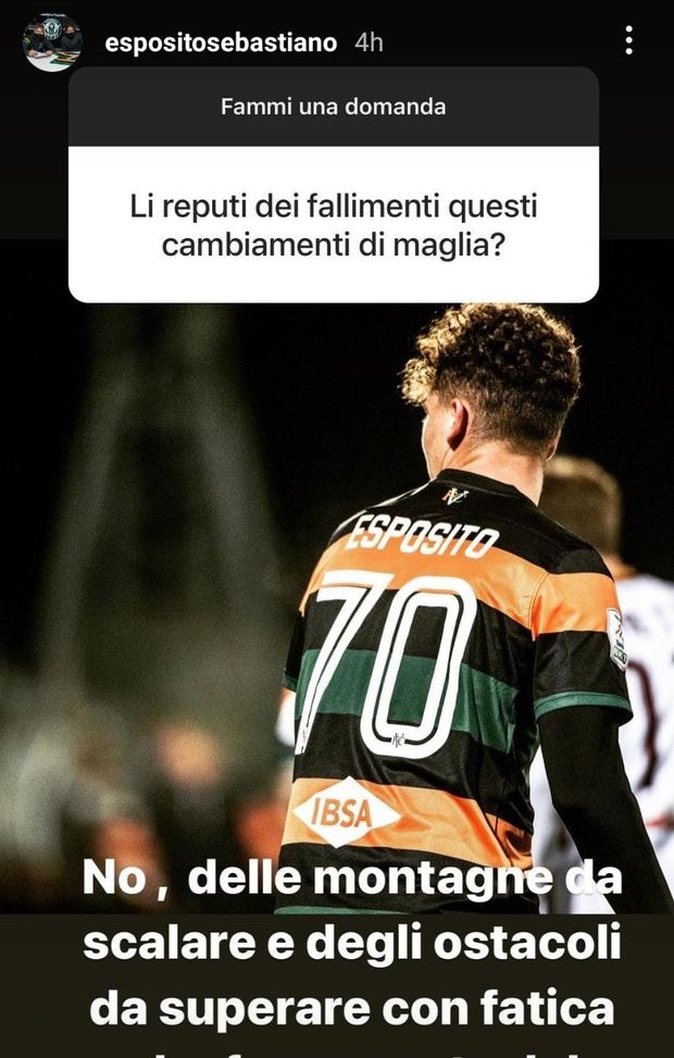 "Li reputi fallimenti i frequenti cambi di maglia?". Esposito non ha dubbi: "No, delle montagne da scalare e degli ostacoli da superare con fatica che fanno parte del gioco e della carriera". Il compagno con cui ha legato di più: "Danilo D’Ambrosio, un fratello". Il grande obiettivo di questa stagione del classe 2002 è "dare e fare il massimo con e per il Venezia". L'idolo di Sebastiano è Francesco Totti, come conferma lo stesso calciatore.