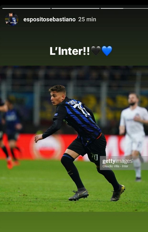 Come vi abbiamo riportato qualche ora fa, l'Inter è pronta a blindare il proprio gioiello, Sebastiano Esposito, con un rinnovo di contratto fino al 2022: il giocatore dovrebbe firmare domani e ufficializzare il prosieguo del suo rapporto con il club nerazzurro. Lo stesso Esposito, intanto, ha postato su Instagram questa storia, dimostrando ancora una volta il suo amore per i colori dell'Inter: