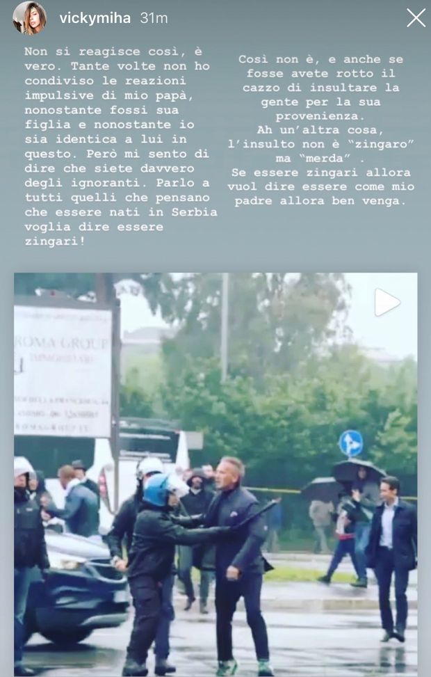 Sinisa Mihajlovic era presente ieri sera all'Olimpico per assistere alla finale di Coppa Italia. Ma l'ex giocatore di Lazio e Inter (ora tecnico del Bologna) si è trovato ad affrontare un gruppo di tifosi che lo avevano insultato in maniera becera dandogli dello zingaro. Sinisa non si è lasciato intimorire e li ha affrontati, per fermarlo ci sono dovuti diversi agenti di polizia. La figlia Viktorija è scesa in sua difesa oggi sui social con una riflessione molto accesa: "Non si reagisce così, è vero. Tante volte non ho condiviso le reazioni impulsive di mio papà, nonostante fossi sua figlia e nonostante io stia identica a lui in questo. Però mi sento di dire che siete davvero degli ignoranti. Parlo a tutti quelli che pensano che essere nati in Serbia voglia dire essere zingari! Così non è, e anche se fosse avete rotto il c***o a insultare la gente per la sua provenienza. Ah, un'altra cosa. L'insulto non è "zingaro", ma "merda". Se essere zingari vuol dire essere come mio padre allora ben venga".