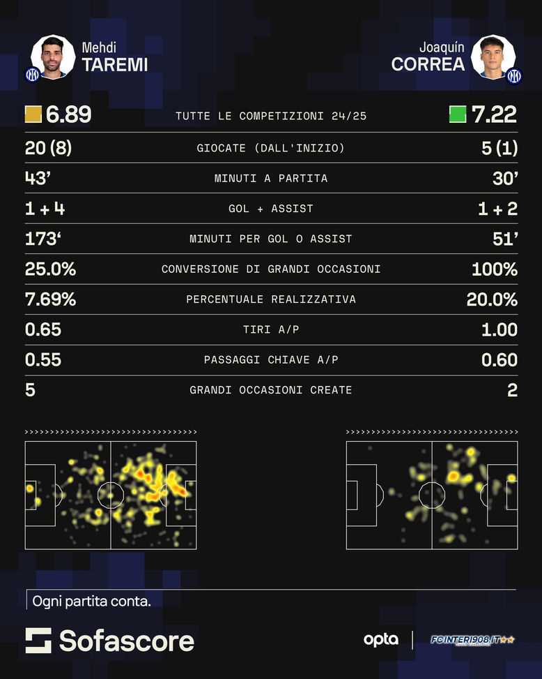 Perché scegliere Correa e non Taremi? Diciamo che i numeri sono dalla parte del Tucu che le poche volte in cui, in questa stagione, è stato chiamato in causa ha risposto in modo positivo. Un gol per ciascuno, Taremi ha più assist all'attivo, ma ha avuto anche più occasioni per dare il suo contributo. Minore l'attesa per un assist o un gol del Tucu rispetto all'iraniano, ma non solo l'argentino ha una % realizzativa migliore, calcia di più verso la porta, effettua più passaggi chiave e converte positivamente un maggior numero di azioni. Si parla di numeri, però il dubbio a Inzaghi potrebbe venire davvero...