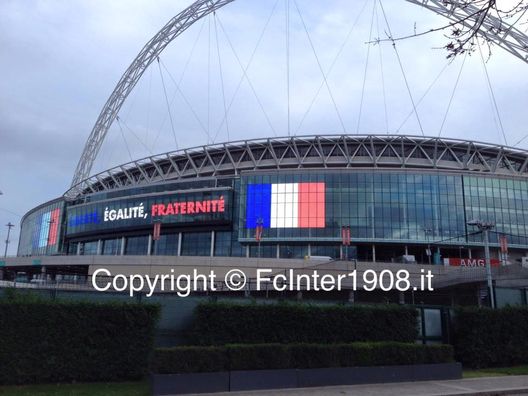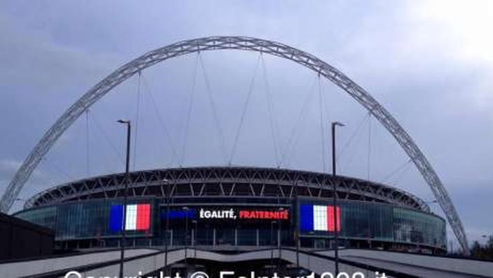 Continuano, in tutto il mondo, i gesti di vicinanza alla Francia dopo i terribili attentati di Parigi della scorsa settimana. In Inghilterra, dove si giocherà l'amichevole contro i Galletti, oggi lo stadio di Wembley si presentava così: