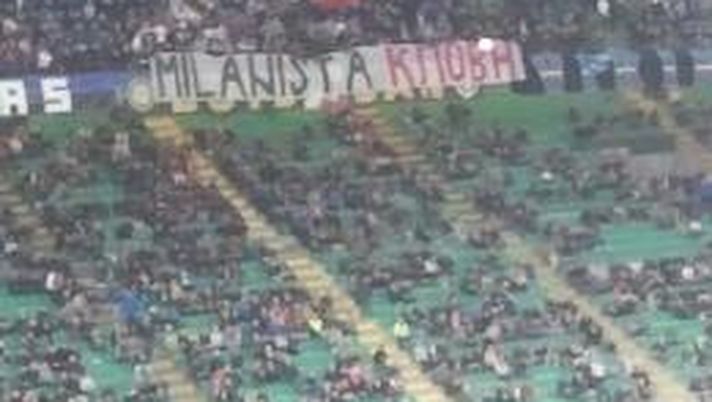 Altro striscione della curva nerazzurra diretto ai colleghi rossoneri, rei di essere gemellati con una frangia di ultrà serbi. Questa volta i tifosi nerazzurri si esprimono in cirillico per dire ai cugini: «Milanista clown».