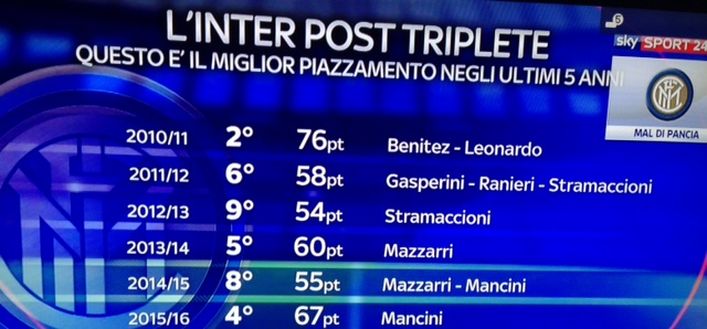 L'Inter ha conquistato in questa stagione il miglior piazzamento dopo quello raggiunto nell'annata 2010/2011 quando arrivò al secondo posto. 67 i punti che la squadra di Mancini ha totalizzato a 90 minuti dalla fine del campionato, blindando il quarto posto. 12 in più rispetto all'anno scorso, 7 in più rispetto alla prima annata di Mazzarri, che si era chiusa con un 5° posto.