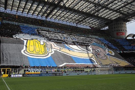 "...anca a mezzdì... viva l'Inter!!!" (anche a mezzogiorno, ndr), recita la coreografia della Curva Nord per il derby di quest'oggi.