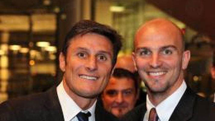 Tra di loro anche Esteban Cambiasso, che qui posa proprio con Zanetti. Balza agli occhi la cravatta di capitan Zanetti, rigorosamente nerazzurra.