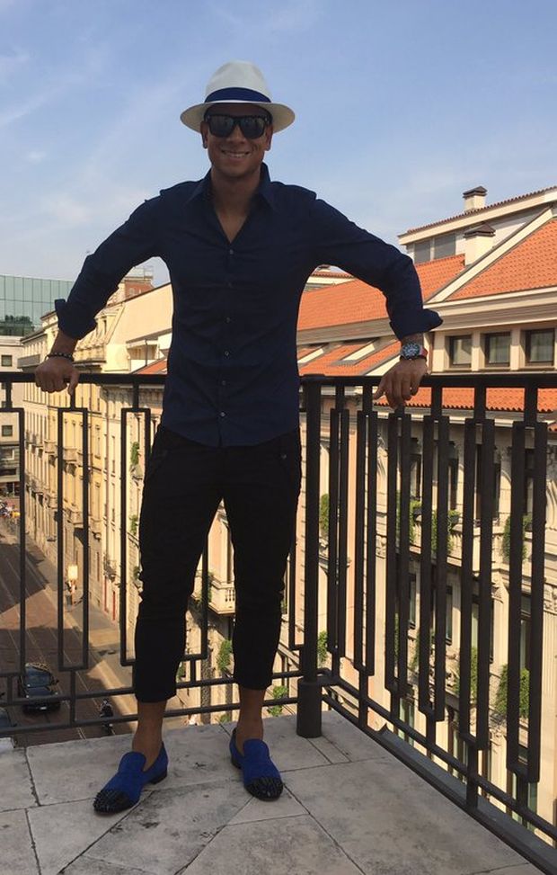 Cappello, camicia, jeans con risvoltino, e scarpe dei colori interisti poi i colori della sua vecchia maglia e un cuore nel tweet in cui scrive: "Nuovamente a casa a Milano per godere della finale di Champions League".