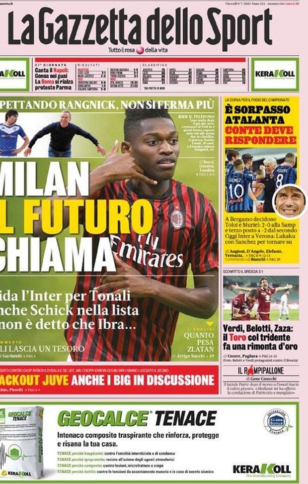 La Gazzetta dello Sport apre l'edizione di giovedì 9 luglio con il mercato del Milan: "Sfida all'Inter per Tonali". Il quotidiano parla anche dell'Inter e della probabile formazione che Conte manderà in campo nella gara contro l'Hellas: "Oggi a Verona: Lukaku con Sanchez per tornare su".