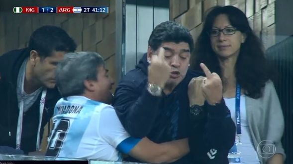 Lo "spettacolo" offerto da Diego Armando Maradona sugli spalti dello stadio di San Pietroburgo ha catturato l'attenzione degli appassionati quasi più di quello messo in campo da Nigeria e Argentina, impegnate in una sfida a dir poco cruciale per il cammino di entrambe nei Mondiali in Russia. Il Pibe de oro aveva già fatto impazzire il web con la sua espressione spiritata seguita al gol dell'1-0 segnato da Lionel Messi. Poi, è arrivato il pareggio della Nigeria, che ha messo sull'orlo del baratro la sua Argentina. Ma all'86' è arrivato il gol qualificazione di Marcos Rojo, che ha fatto esplodere tutti gli argentini, compreso Diego. Che, preso dall'euforia e dalla solita esuberanza, si è lasciato andare a un gesto non propriamente elegante. Forse infastidito da qualche spettatore seduto poco più avanti di lui, infatti, Maradona ma mostrato il dito medio con entrambe le mani, insultando i malcapitati. Non proprio un'immagine qualificante. Almeno in Argentina si consoleranno con la qualificazione agli ottavi.