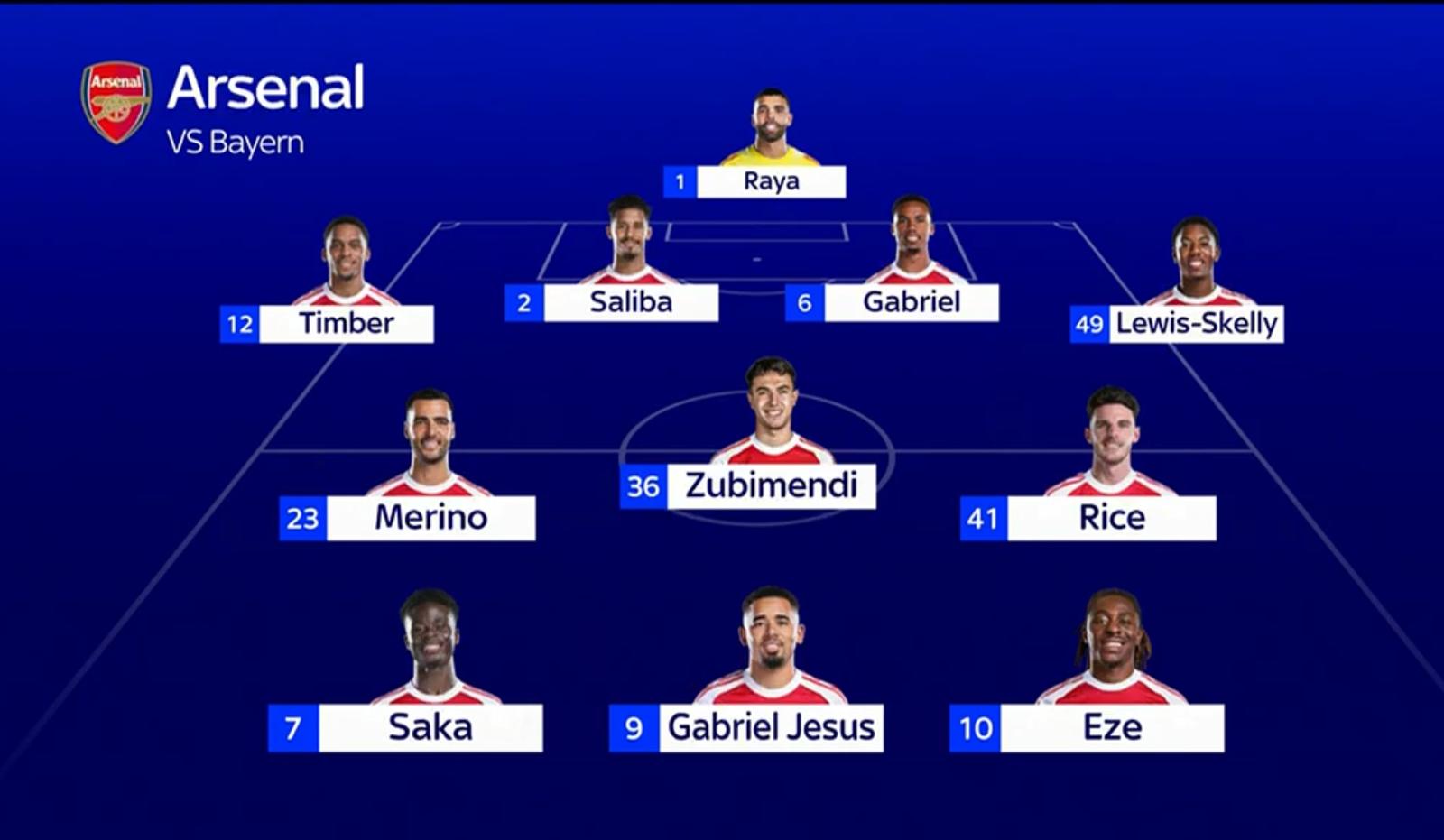 ARSENAL: Raya, Timber, Saliba, Gabriel, Lewis-Skelly, Merino, Zubimendi, Rice, Saka, Gabriel Jesus, Eze