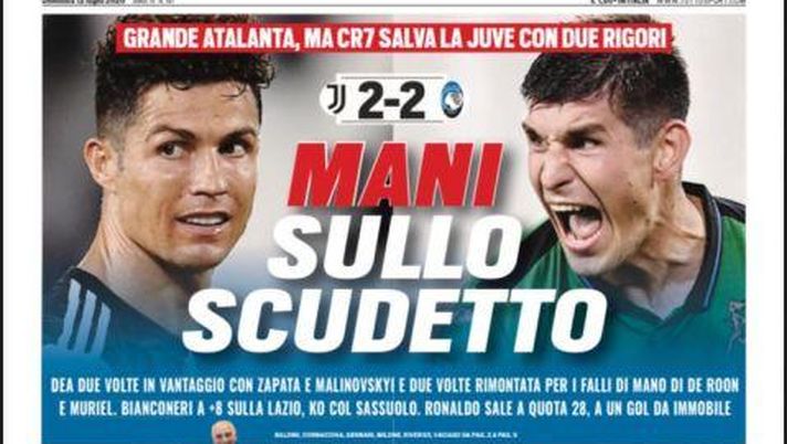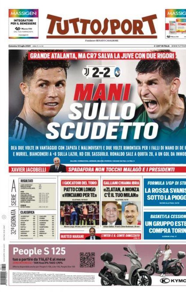 Tuttosport apre l'edizione di domenica 12 luglio con il pari raggiunto in extremis dalla Juventus contro l'Atalanta grazie alla doppietta su rigore di Cristiano Ronaldo. Si parla anche della squadra nerazzurra con Matteo Marani: "L'Inter e il Conte dimezzato".