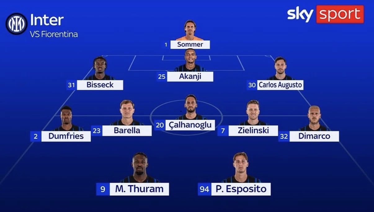 Cristian Chivu ha deciso la formazione titolare anti-Fiorentina per domani (qui dove vedere il match in tv e streaming). Nell'Inter è atteso il ritorno dal 1' di Hakan Calhanoglu, ecco tutte le scelte pronte nell'undici di partenza secondo Sky Sport.