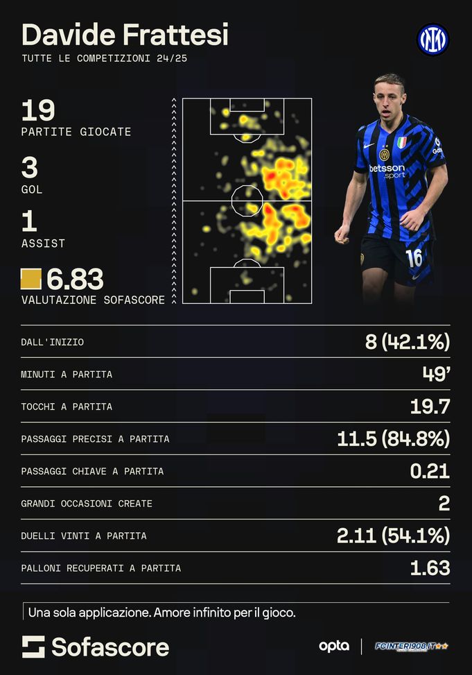 Finora il ruolino di Frattesi è stato più che positivi in 19 partite giocate (8 da titolare) ha messo a segno 3 gol e un assist, un bottino di tutti rispetto. La sua heatmap fa notare come Inzaghi lo veda mezzala destra e preferisca spostare Barella sull'altro fronte (o alternarlo a lui).
