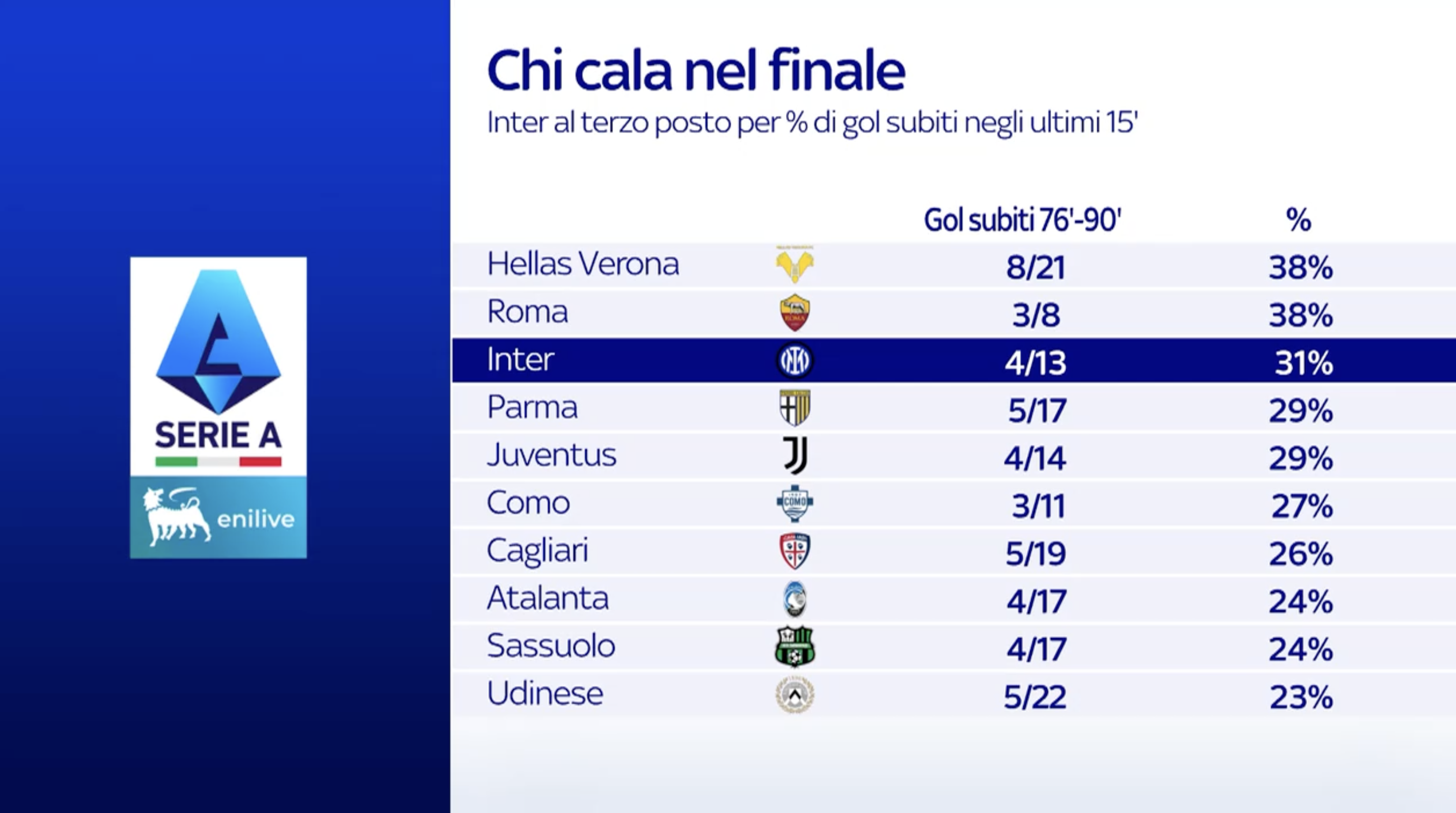 È vero che tre su otto è comunque una percentuale del 38% quasi, come il Verona l'Inter viene subito dopo con il 30,7%, quindi il 31% dei gol subiti sono negli ultimi quindici minuti. Quindi c'è un calo evidentemente su cui si deve lavorare.