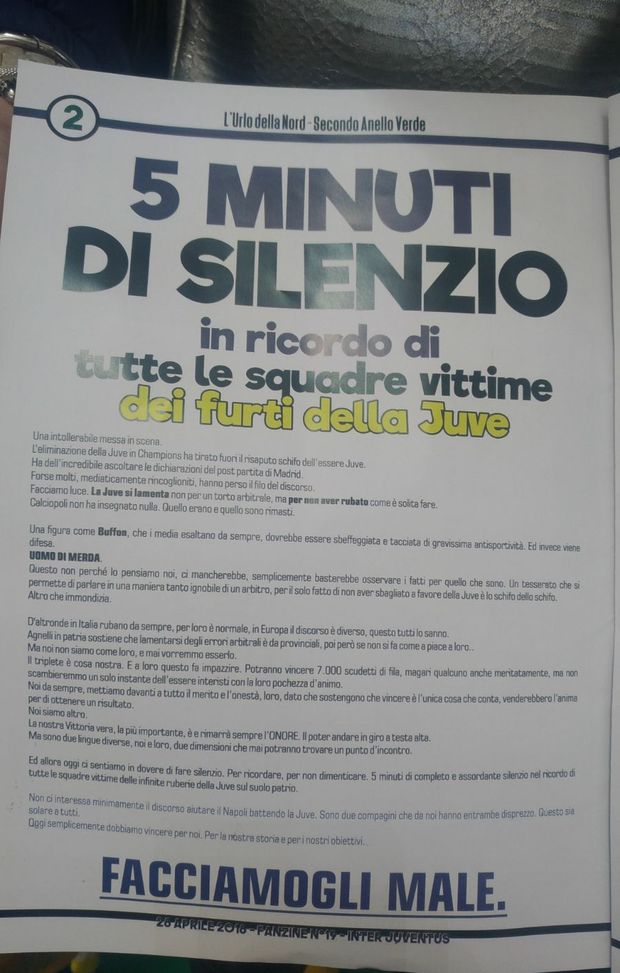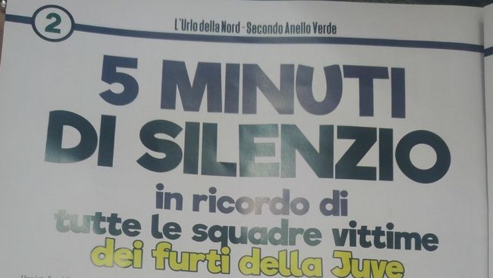 Al secondo anello verde, in Curva Nord, sul giornalino 'L'Urlo della Nord', in occasione della gara contro la Juventus è spuntato un articolo che dice a grandi lettere nel titolo: "Cinque minuti di silenzio in ricordo di tutte le squadre vittima dei furti della Juventus". E il riferimento è chiaramente all'eliminazione in Champions League della squadra bianconera e a tutte le polemiche nate per il rigore concesso al Real Madrid all'ultimo minuto, segnato da Ronaldo, che ha eliminato la formazione italiana dalla Coppa.