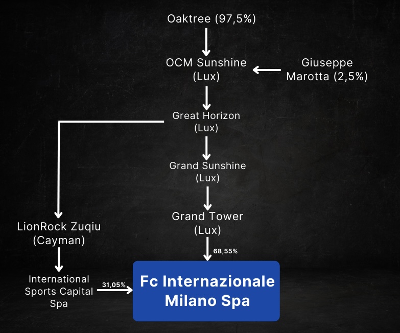 "Il 13 agosto è andata in scena una assemblea generale di OCM Luxembourg Sunshine, la società creata nel maggio 2021 per gestire inizialmente il prestito che Oaktree aveva garantito alla famiglia Zhang. OCM Luxembourg Sunshine possiede interamente Great Horizon, che a sua volta ha il controllo da un lato di LionRock Zuqiu (che controlla il 31% dell’Inter tramite l’italiana International Sports Capital) e dall’altro di Grand Sunshine e, a scendere, di Grand Tower, che controlla il 68,55% del club nerazzurro".