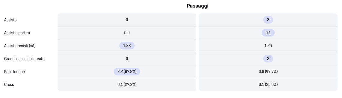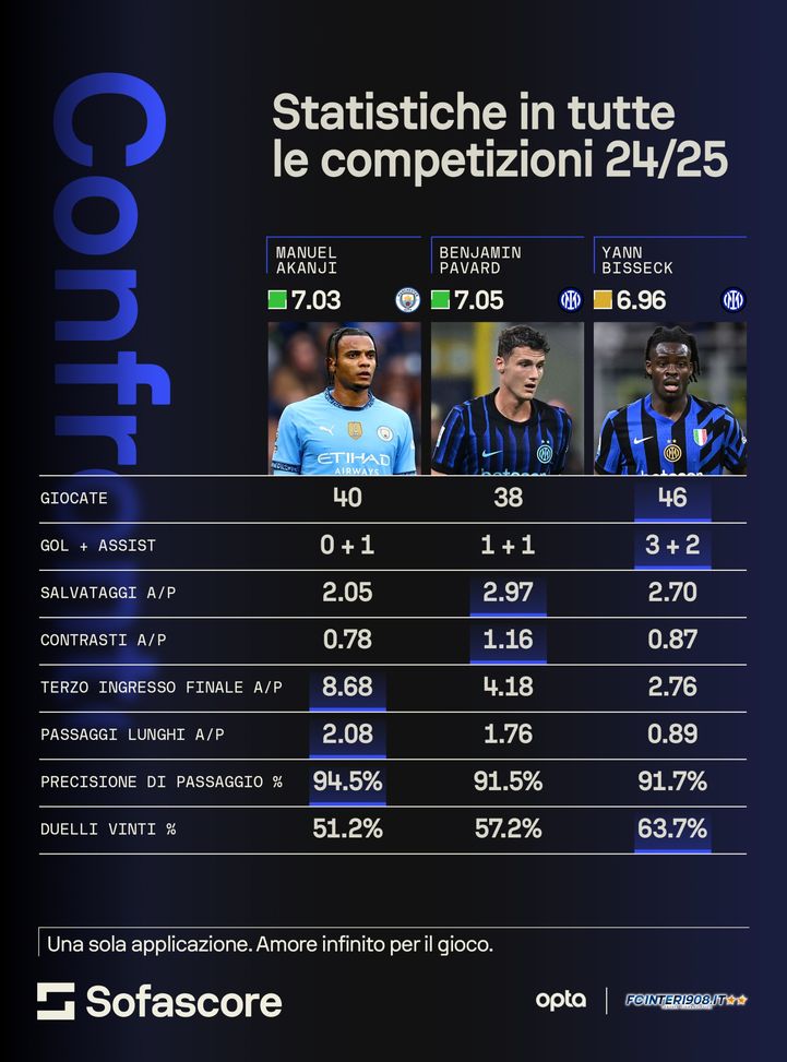 Dal confronto tra i 3 giocatori emerge la tendenza dello svizzero a solcare con maggiore continuità la metà campo avversaria, anche probabilmente per l'attitudine della squadra. I due nerazzurri hanno trovato maggiormente la via del gol, mentre l'ex City è un elemento prezioso anche in costruzione. La sue percentuale di precisione nei passaggi è del 94,5%, contro il 91% dei due difensori nella scorsa stagione in maglia Inter. Akanji ricorre con maggiore insistenza sulla palla in verticale, dato non da trascurare vista la richiesta di Chivu di evitare il palleggio sterile e cercare di andare con più costanza dagli attaccanti.