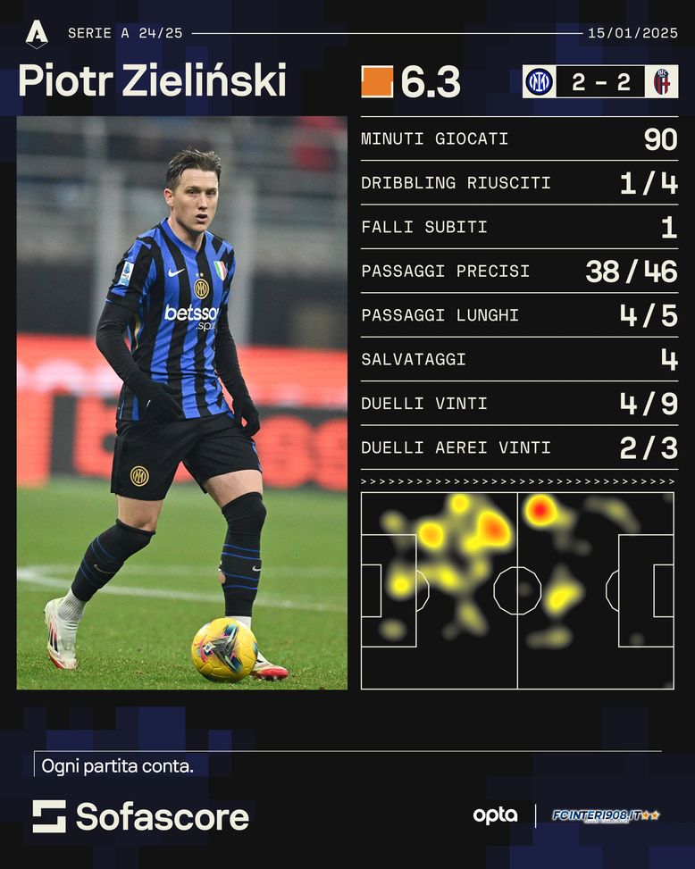 Se l'ipotesi di un cambio modulo non è contemplata da Inzaghi, giustamente visto i meccanismi collaudati del suo 3-5-2, tocca trovare un'alternativa in regia a Calhanoglu. Non considerando il mercato, impossibile trovare qualcuno di livello che possa venire a fare da vice al turco, forse Inzaghi potrebbe specializzare e sfruttare meglio Zielinski. Contro il Bologna qualche guizzo lo ha avuto: 70' da mezzala sinistra, 20' in regia a sostituire Asllani.