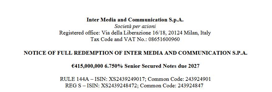 Il 13 giugno 2025, Inter Media and Communication S.p.A. (l’“Emittente”) ha comunicato, ai sensi della Sezione 3.03 dell’atto di indenture datato 9 febbraio 2022 (l’“Indenture”), l’avviso condizionato di rimborso integrale (il “Conditional Notice of Full Redemption”). Tale Indenture è stato stipulato tra, tra gli altri, l’Emittente, The Law Debenture Trust Corporation p.l.c., in qualità di trustee e rappresentante delle garanzie per i Titolari (il “Trustee”), Intesa Sanpaolo S.p.A., in qualità di agente della garanzia (il “Security Agent”), The Bank of New York Mellon, filiale di Londra, in qualità di agente pagatore principale (il “Paying Agent”), e The Bank of New York Mellon SA/NV, filiale di Lussemburgo, in qualità di registrar e agente per i trasferimenti, in base al quale l’Emittente ha emesso le proprie obbligazioni garantite senior del valore di €415.000.000, con cedola del 6,750% e scadenza nel 2027 (le “Obbligazioni”).