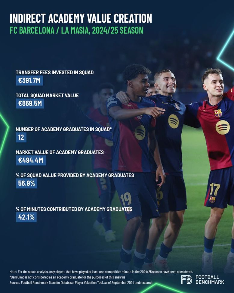 Un esempio lampante dell'impatto indiretto di un'accademia è La Masia dell'FC Barcelona. Dopo un periodo finanziario turbolento caratterizzato da perdite significative (un EBIT cumulativo di -840 milioni di euro tra le stagioni 2020/21 e 2022/23) e costi del personale eccezionalmente elevati, l'attuale squadra del Barcellona è ora composta in gran parte da laureati dell'accademia. Circa la metà della squadra proviene da La Masia, inclusi sei degli undici titolari nell'ultimo El Clásico, vinto in modo convincente dai Blaugrana.