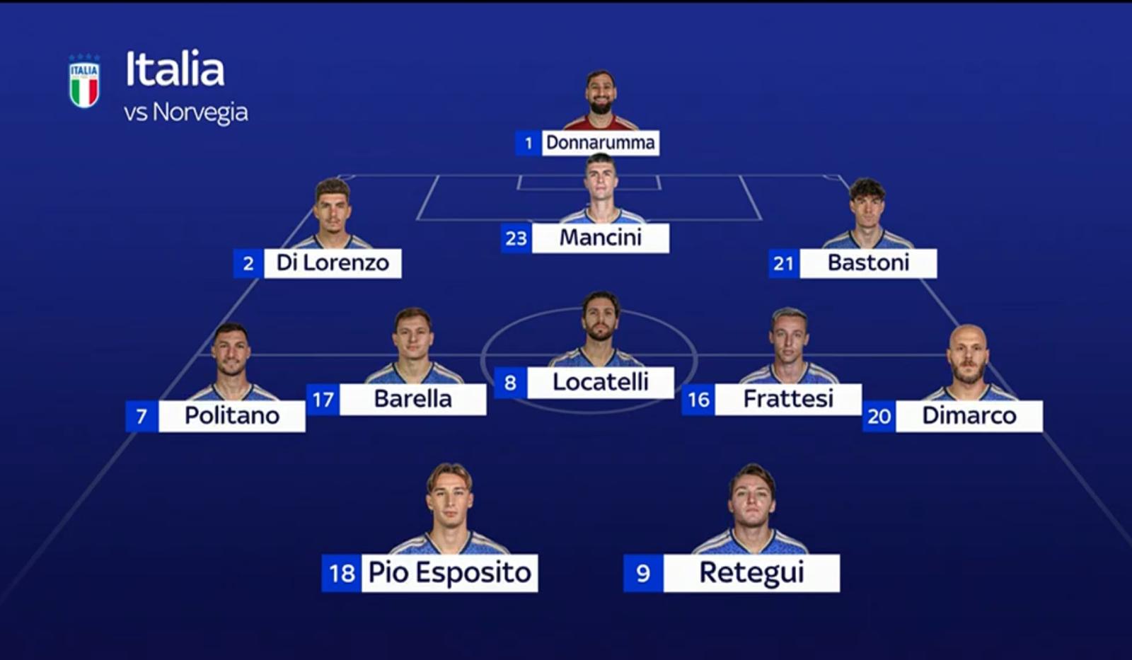 3-5-2 per il c.t. azzurro che in difesa punta sul trio formato da Di Lorenzo, Mancini e Bastoni. Fasce formate da Politano a destra e Dimarco a sinistra, mentre Barella, Locatelli e Frattesi completano il centrocampo. Coppia d'attacco formata da Pio Esposito e Retegui.