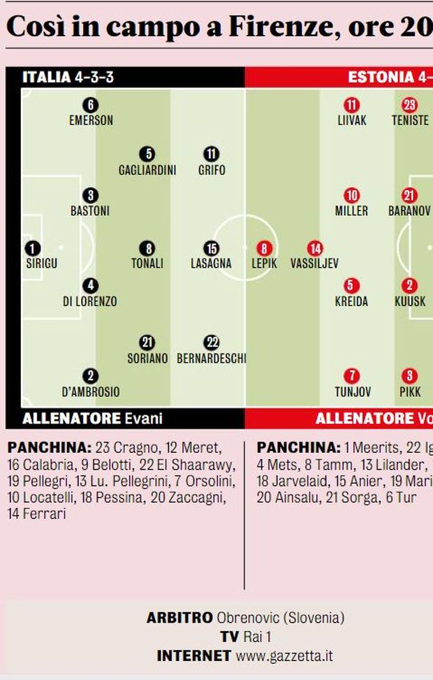 "In mediana, volante a Tonali, spalleggiato da Soriano e Gagliardini. In difesa, subito precettati gli interisti Bastoni e D’Ambrosio, che salterà la Polonia per squalifica. In arrivo anche Barella" riferisce La Gazzetta dello Sport.